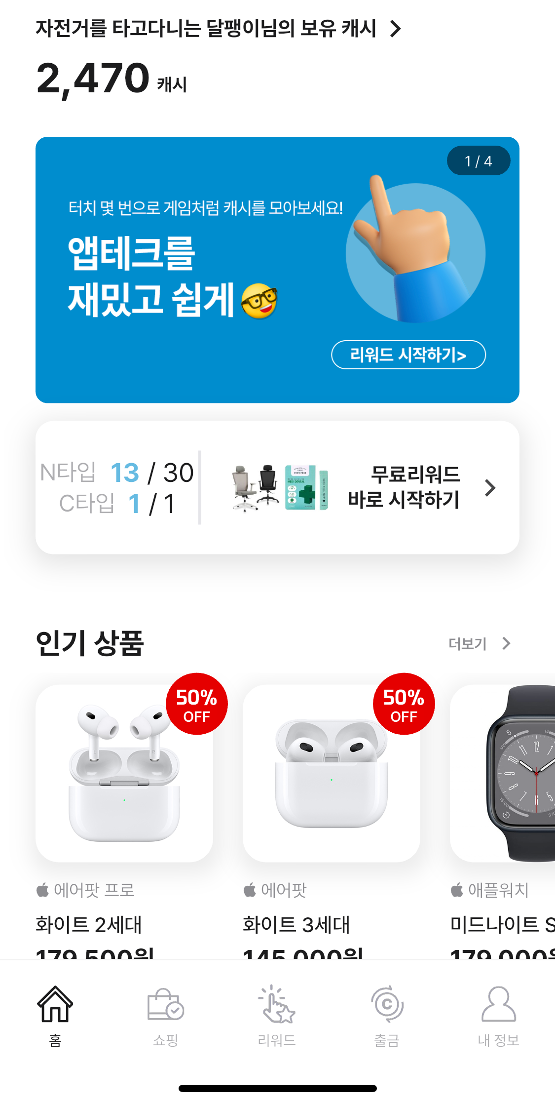 이 모든 걸 '50% 할인가'로. 리워드 적립 캐시로 50% 쇼핑 혜택을 즐겨보세요.